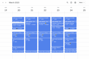 Create a default weekly calendar layout (with recurring time blocks), then adjust week-to-week. This makes planning nearly automatic.
